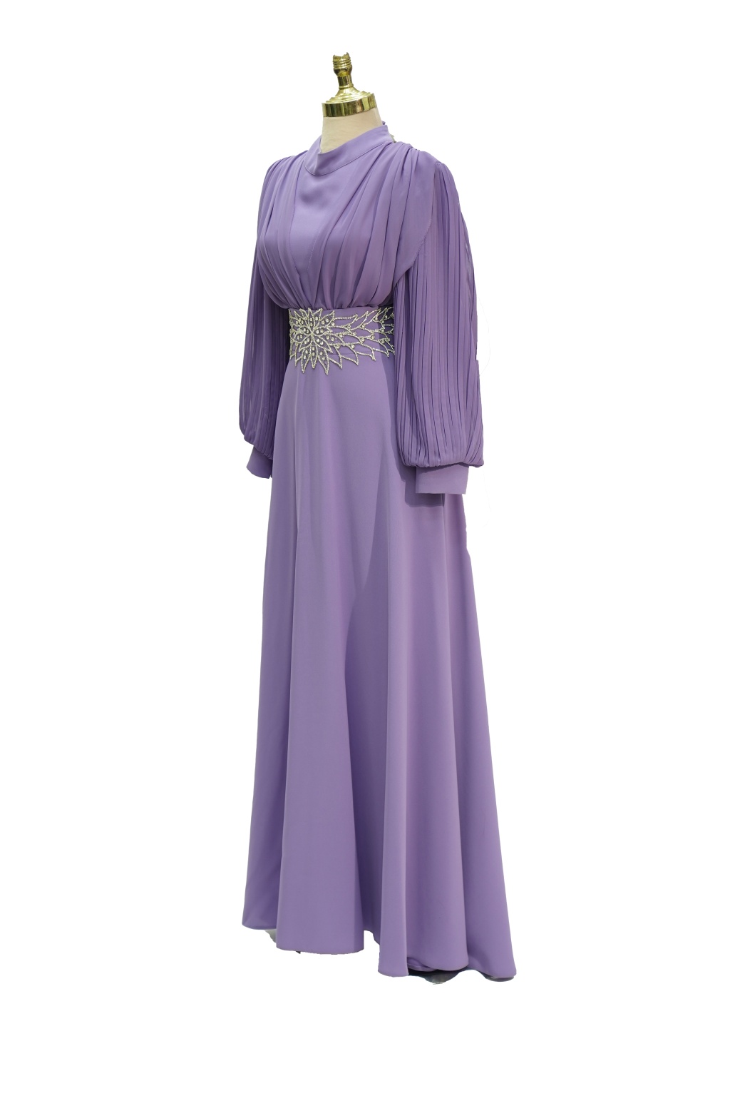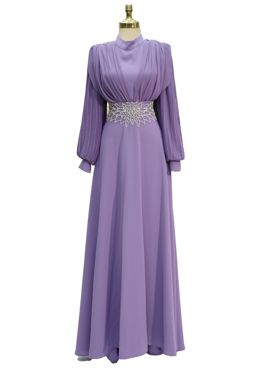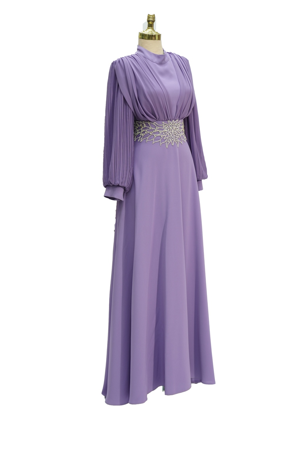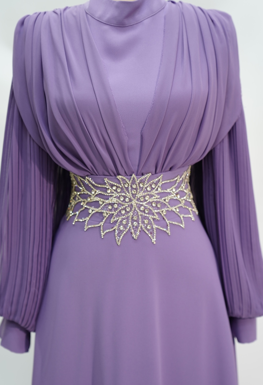 4149 MISRA KOL ŞİFON BEL TAŞLI ELBİSE LİLA