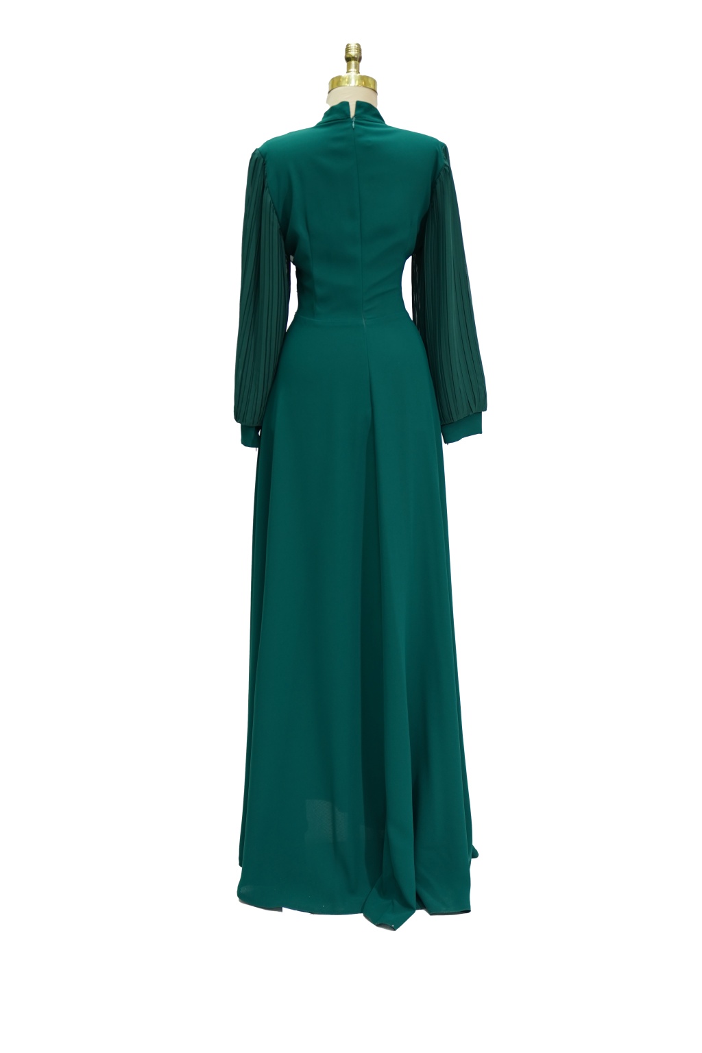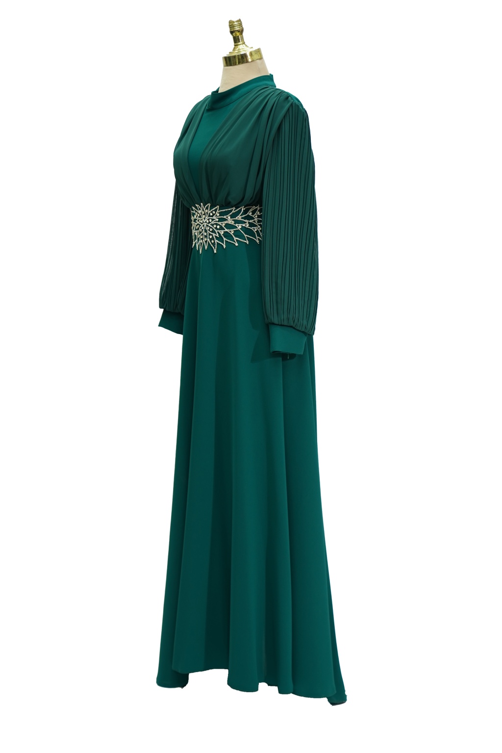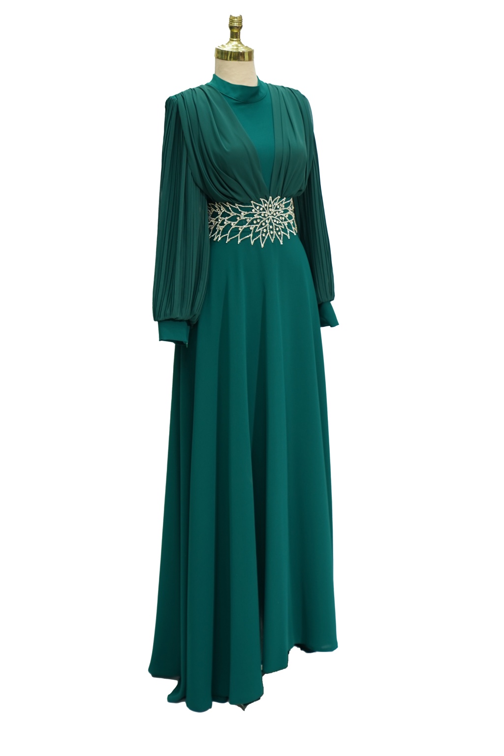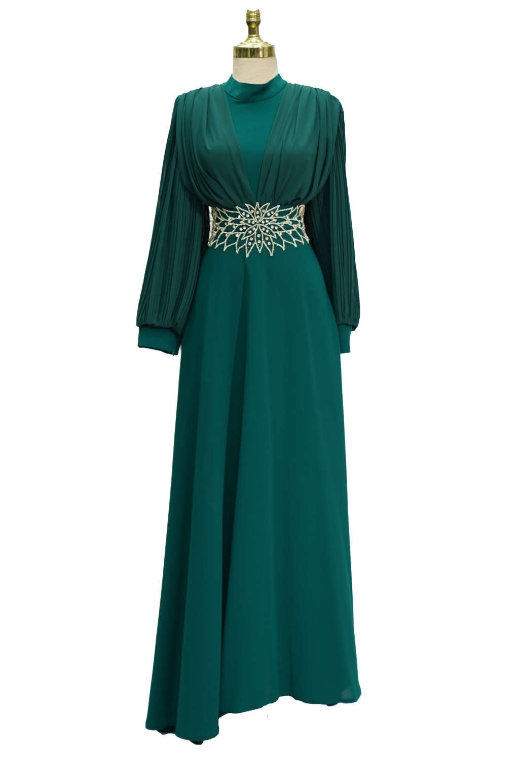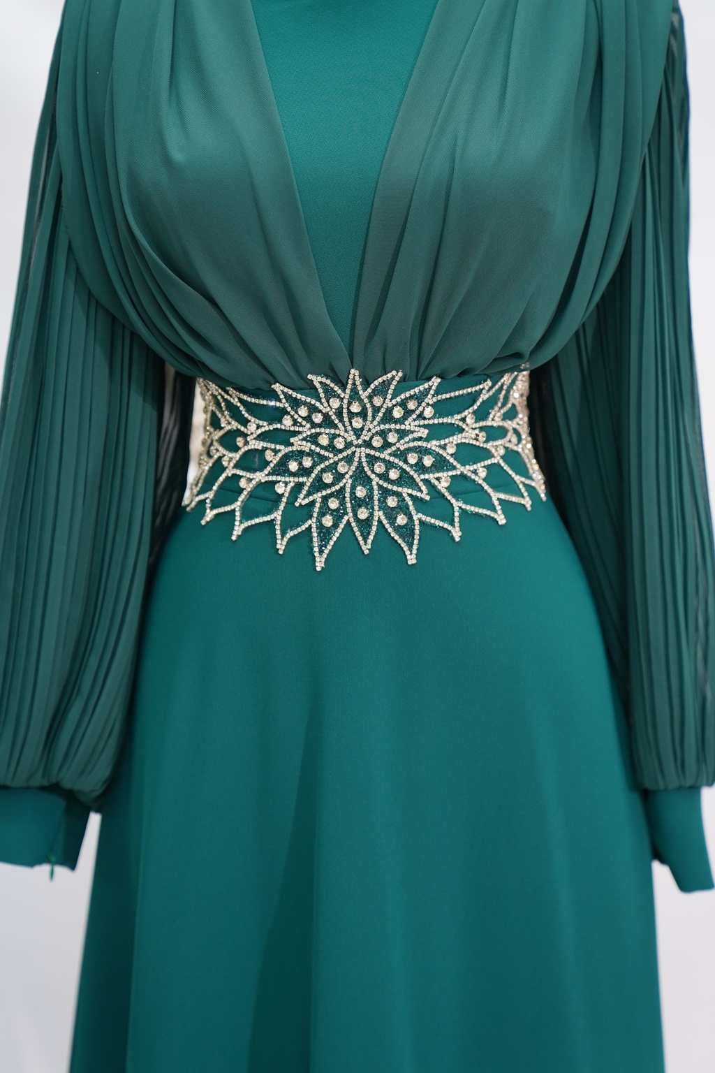4149 MISRA KOL ŞİFON BEL TAŞLI ELBİSE ZÜMRÜT